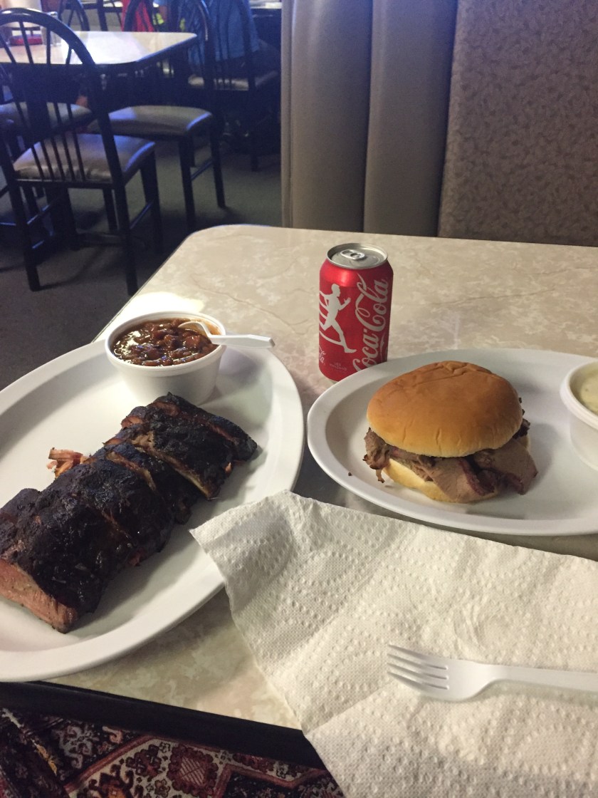 I was going to eat BBQ in St. Louis tonight but at my crawdad pace it became evident I would be pretty late. So, I pulled over outside Kansas City and looked up “BBQ near me” on Google. I came up with a place nine miles away off the highway called Porky’s (http://www.porkysblazinbbq.com/). It was pretty awesome. Real basic… order at the counter, cash only, bus your own tables. I ordered a lot and now my (still working) frig is stocked! I loved the place because they had signs everywhere telling the customer what to do – and NOT do. It reminded me of myself at Jam! I love a good sign.
